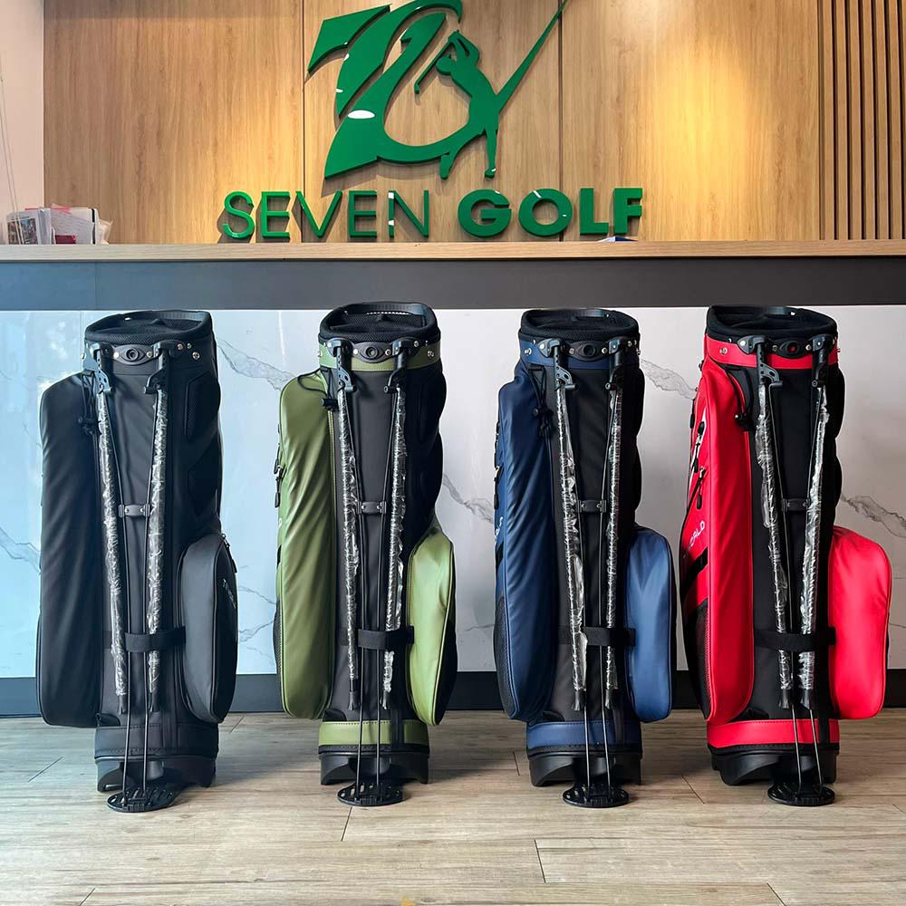 - Túi có cơ chế lò xo bật hay gấp phần giá đỡ ra ngoài khi bạn đặt túi xuống, cho phép túi đứng thẳng một góc 45 độ. Điều này giúp golfer dễ dàng lấy và cất gậy golf. Phần chân chống có thể thu vào được làm từ sợi carbon để tăng thêm độ bền mà không tăng thêm trọng lượng.